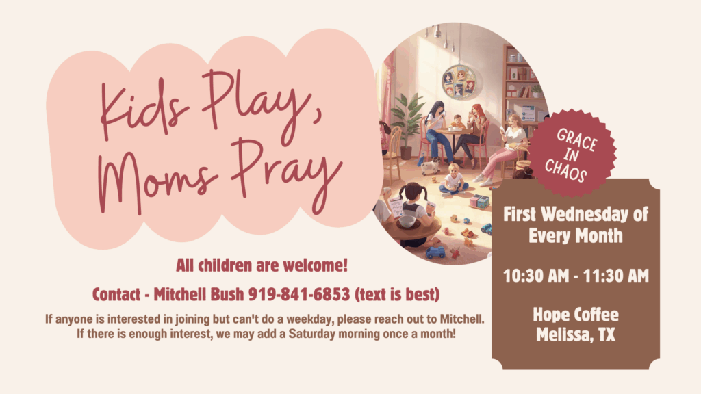 All children are welcome! Our goal is 15-30 minutes reflecting on that months readings/questions, then 30-45 minutes fellowship. We will hold each other accountable to complete the study, have fellowship, and talk all things mom!